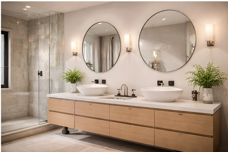 Banheiro planejado com design funcional, acabamentos elegantes e marcenaria sob medida.